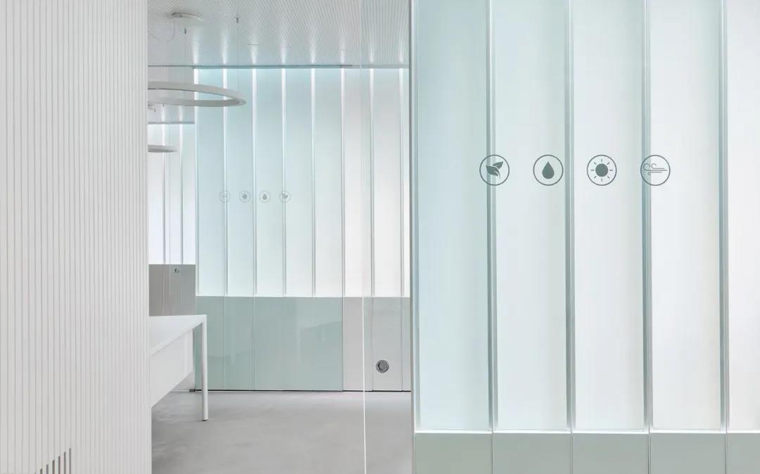 辦公室的外圍采用玻璃圍成,給內(nèi)空間景色造成透視感,讓人一眼可以看到室內(nèi)的光屏墻,波浪形光屏的凸面圍合出新的區(qū)域。