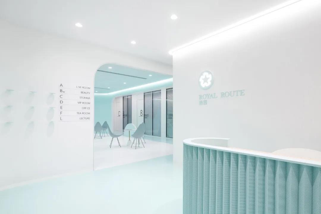 藍(lán)綠色是平時多見用于餐飲空間和商業(yè)空間中,用在辦公空間里還是很少見的,但是真的絕??!項目業(yè)主是一家主營皮膚管理的生物科技公司,設(shè)計以特制的藍(lán)綠色搭配白色奠定了空間的主色調(diào),前廳采用白色和燈帶暈染浪漫唯美的氛圍,突出藍(lán)綠色格柵的接待臺。內(nèi)部空間則大部分采用了淺淡的藍(lán)綠色,被這樣溫柔清新的空間包圍著,感覺自己煩躁的心情會立馬就變得平靜了。