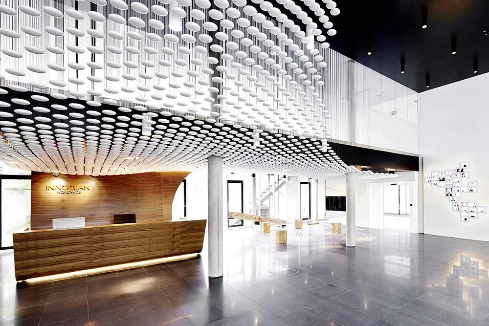 這是韓國(guó)的國(guó)際廣告公司INNOCEAN位于德國(guó)的新辦公室。不同于其他辦公室都是統(tǒng)一的風(fēng)格,這里的幾乎每一個(gè)辦公區(qū)間都是一種不同的風(fēng)格,讓員工在不同的空間內(nèi)感受不同的氛圍,既百變又靈活有趣。前廳的吊頂設(shè)計(jì)很吸睛!一顆顆似白玉棋子一樣的吊飾整齊鋪排在空間上方(密集恐懼者患者看了想打人),營(yíng)造動(dòng)人的旋律感~地板上設(shè)有相呼應(yīng)的白色圓點(diǎn),斜角的線條狀將視線引導(dǎo)至前臺(tái)。天花板噴黑漆,突顯出吊飾,白色的小筒燈隱藏其中,既有點(diǎn)亮,又有照明的功能。