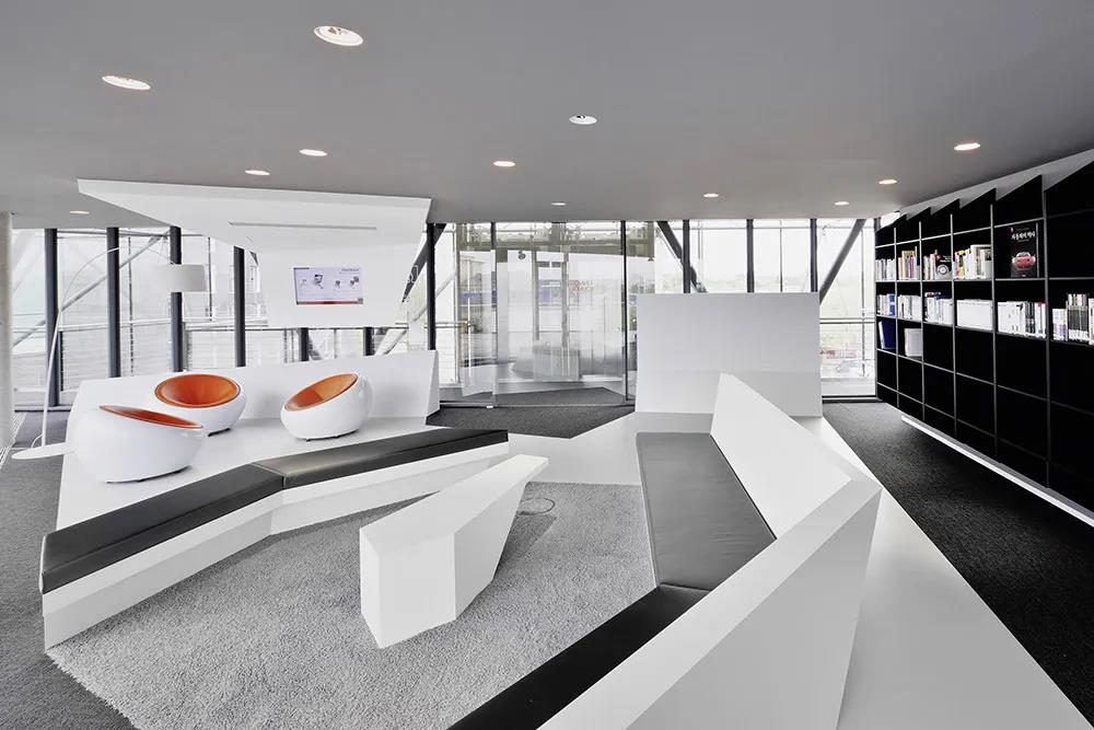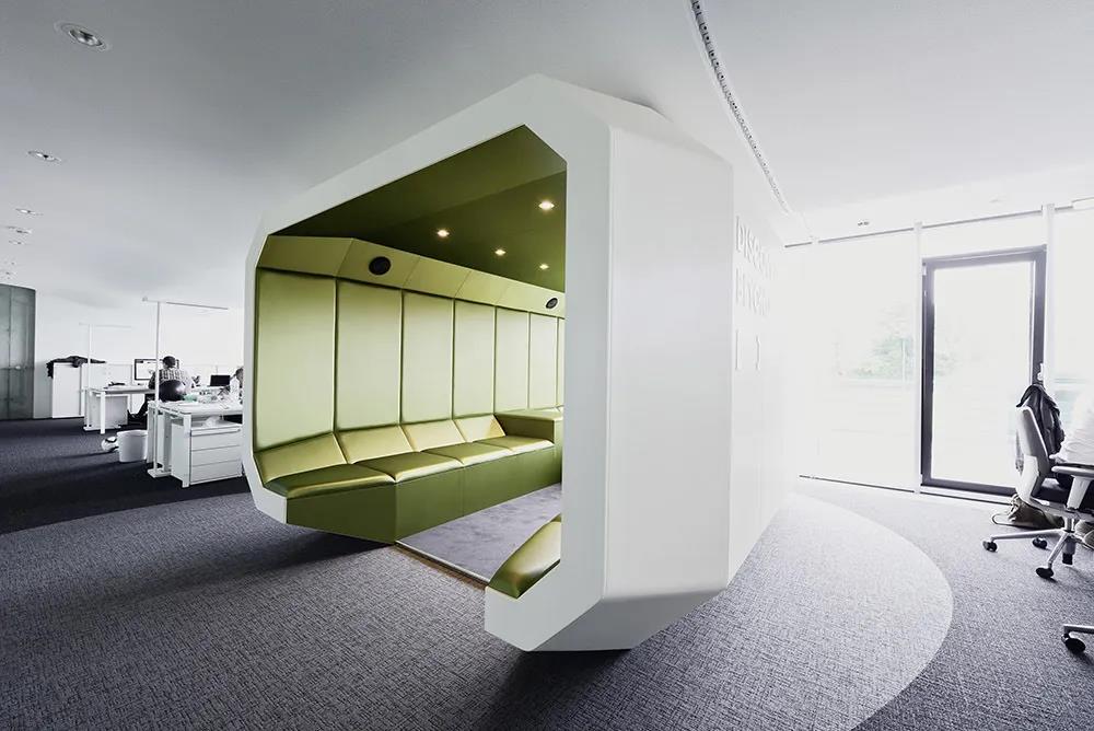 到了休閑區(qū),在灰色調(diào)中營(yíng)造出一個(gè)白色空間,吊頂和地板相對(duì)應(yīng),橘色作為點(diǎn)亮色,還有不規(guī)則圍合起來(lái)的沙發(fā)式坐椅,營(yíng)造出一種科技風(fēng)的感腳,另一邊有個(gè)白色造型的休閑空間,里面是一個(gè)半開放的包廂,空間內(nèi)的綠色讓人感到舒適放松。