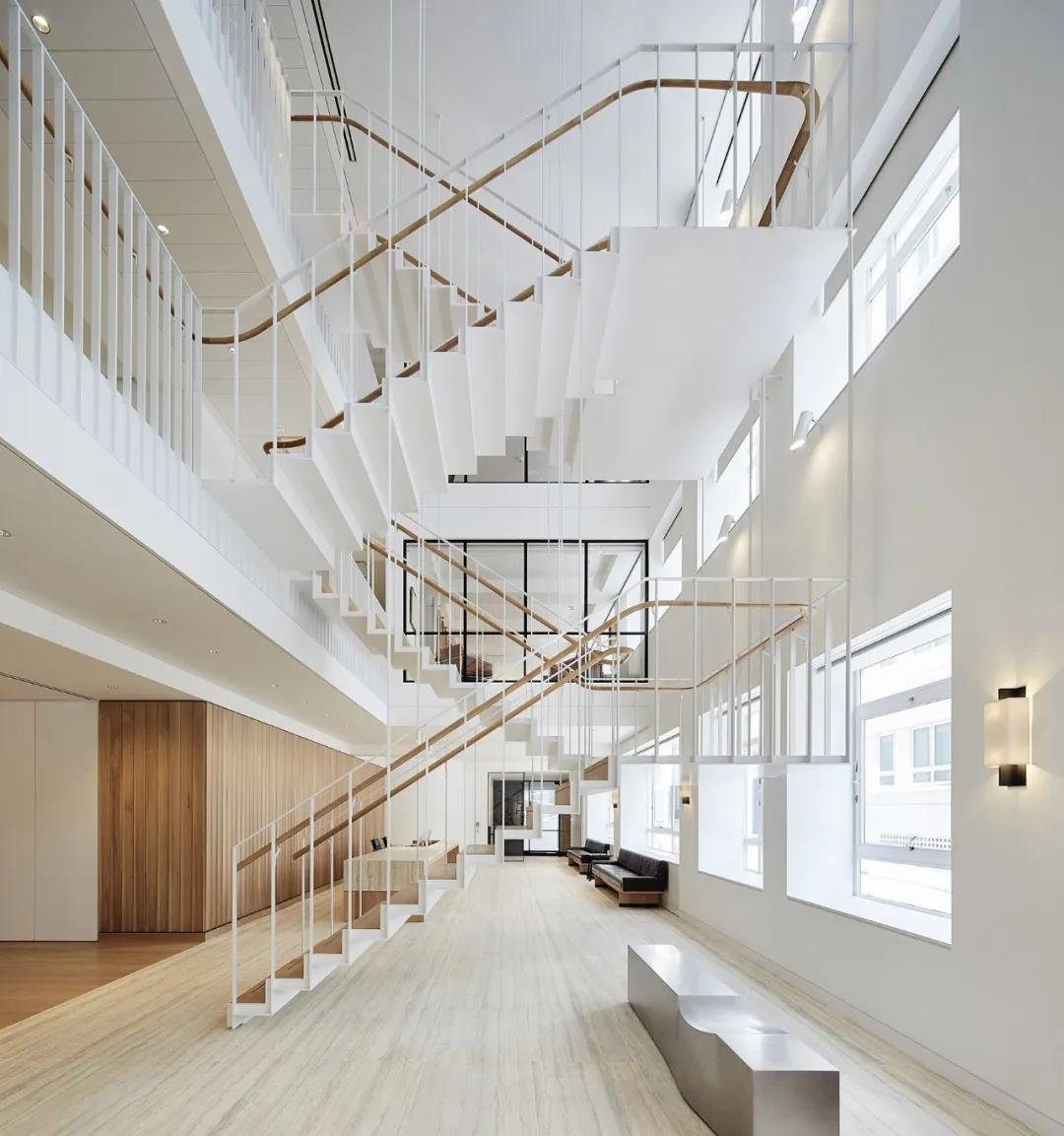 項目中最重要的一個結構干預是在既有的樓板上切割出了一個三層高的中庭空間,并在其中置入了雕塑般的樓梯。樓梯打開了建筑內(nèi)部的動線,將原本彼此孤立的樓層和辦公部門重新連接起來,讓建筑內(nèi)部的行走體驗變得順暢而輕快。非正式的協(xié)作空間和社交空間被設置在每個樓層的樓梯旁邊,進一步促進了各部門的互動以及視覺上的連接。
