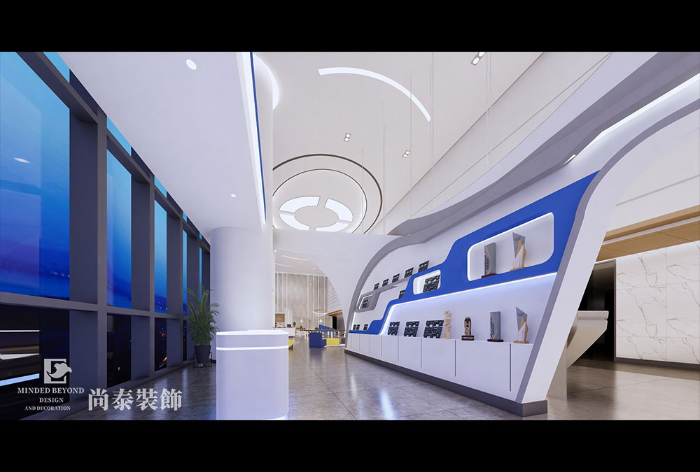 前廳、展廳等公共區(qū)域多以造型彰顯企業(yè)氣質(zhì),冷暖結(jié)合,曲直相交,