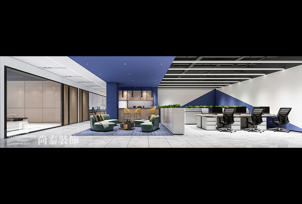 辦公區(qū)和休閑區(qū)采用企業(yè)色藍色作為主題色,活潑靈動感十足;布藝休閑家具,吧臺等設(shè)計給員工打造舒適人性化的生活工作空間。
