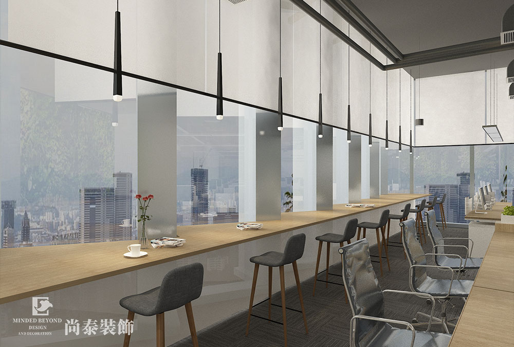 為緩解員工辦公的緊張感,開放辦公區(qū)在落地玻璃幕墻邊特意設(shè)計了吧臺,工作之余一杯咖啡茶飲,遠眺城市風光,十分愜意。
