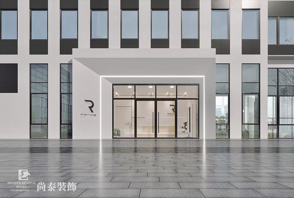 本案辦公空間位于高新產(chǎn)業(yè)園區(qū)一樓,門頭可直接對外,設計師將門頭設計為外擴斜面造型,十分大氣顯眼;前廳進門兩側(cè)設計了燈膜和綠植造景;吊頂為無主燈設計;背景墻采用格柵式+燈帶設計,品牌logo居左,彰顯質(zhì)感和高端大氣的企業(yè)形象;兩側(cè)門洞一側(cè)通往展廳和車間,一側(cè)通往辦公區(qū),門洞同樣使用燈帶來彰顯科技感。